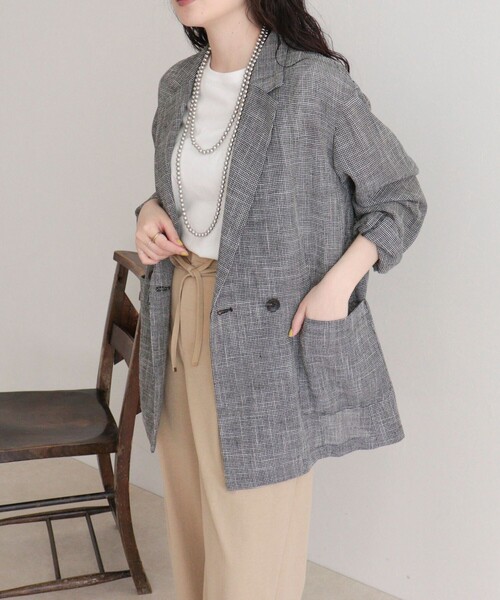 とろみ素材のパンツは、ジャケットのかっちり感をやわらかく緩和してくれる存在。動きに合わせて揺れるシルエットが、ナチュラルで美しい抜け感を生み出します。ジャケットも季節感を呼び込むシアー素材をチョイスすることで、肩肘張らない姿に。