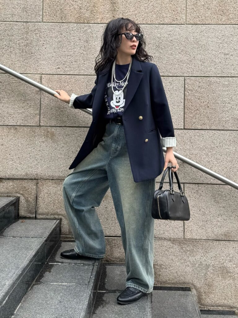 ネイビージャケットとヴィンテージライクなデニムの組み合わせは、カジュアルの中に知性を感じさせる着こなし。ダークトーンで揃えることで、大人顔な雰囲気に落ち着きます。キャラクターTを差し込めば程よい遊び心が加わり、堅さをやわらかく中和。シンプルなのに印象に残る、計算された大人カジュアルです。
