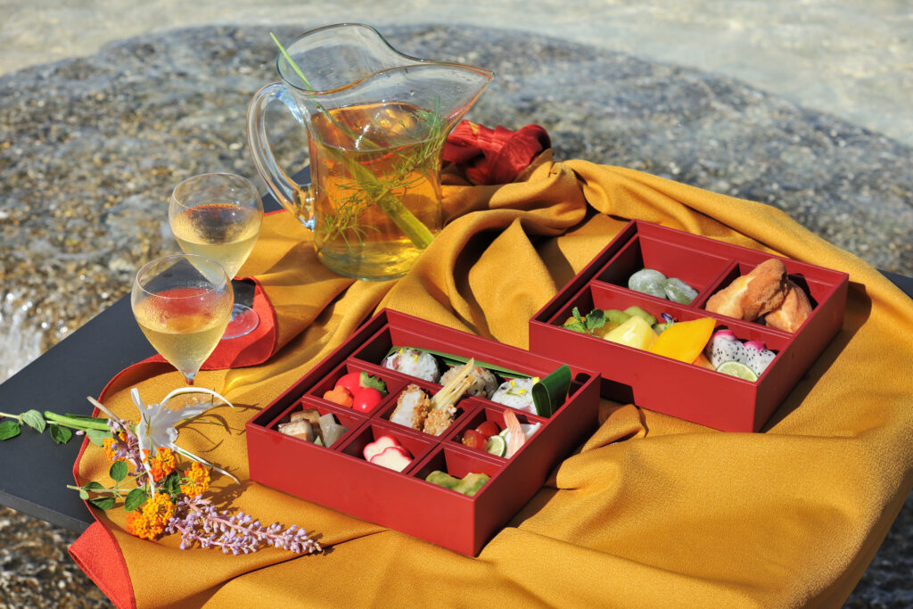 琉球王朝時代から旧暦とともにある沖縄の年中行事のひとつ「はまうり※3 」は、女性たちの無病息災と幸せを願って海水で心身を清める祭祀で、旧暦の3月3日にあたります。行事のあとに浜で食事をしていたことにちなんで、海岸で食べます。星のや沖縄のシェフが沖縄伝統の「三月御重(さんぐゎち うじゅー)」を華やかに仕立てました。