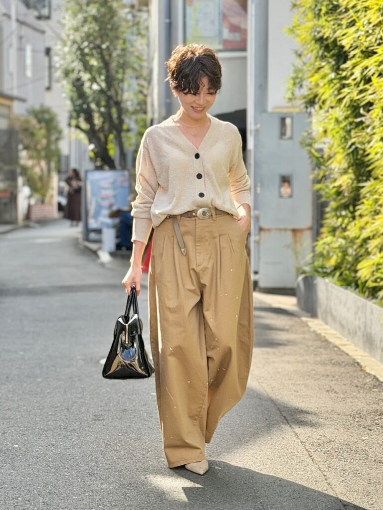 ワントーンコーデは、色数を抑えることで自然と垢抜ける着こなしテクニック。春の陽気にぴったりのあたたかなベージュを使えば、より柔らかく上品なニュアンスを作れます。素材や質感に変化をつけることで、のっぺり感を防げるのもポイント。難しい小技要らずで洒落て見える、大人の余裕を感じる着こなしです。