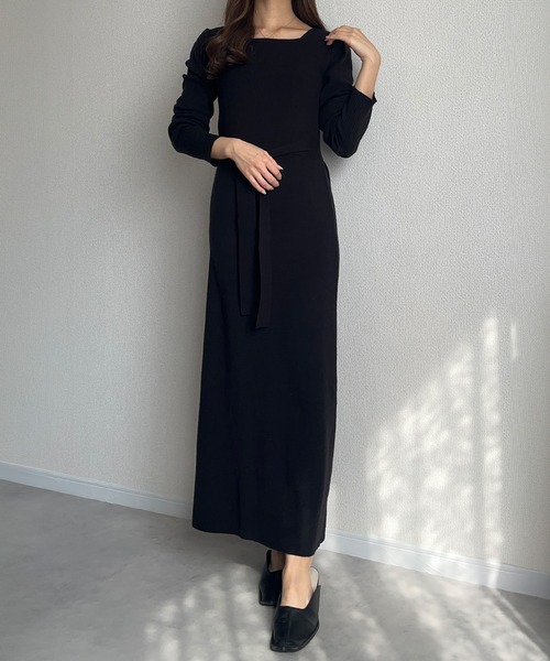 【骨格ストレート向け】ベルト付きスクエアネックニットワンピース