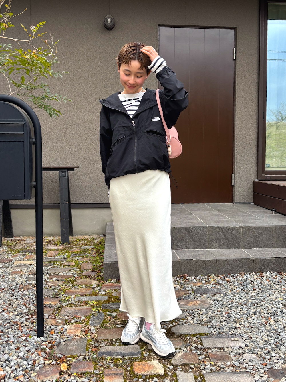 マウンテンパーカーは、防寒や風よけを担いながらも洗練感を演出できる優秀アウター。あえて女性らしいサテンマーメイドスカートと合わせることで、カジュアルに寄りすぎない大人バランスに仕上がります。足元はスニーカーを持ってきて、動きやすさをキープ。お花見の買い出しや場所取りなど、たくさん歩く日に真似したい組み合わせです。