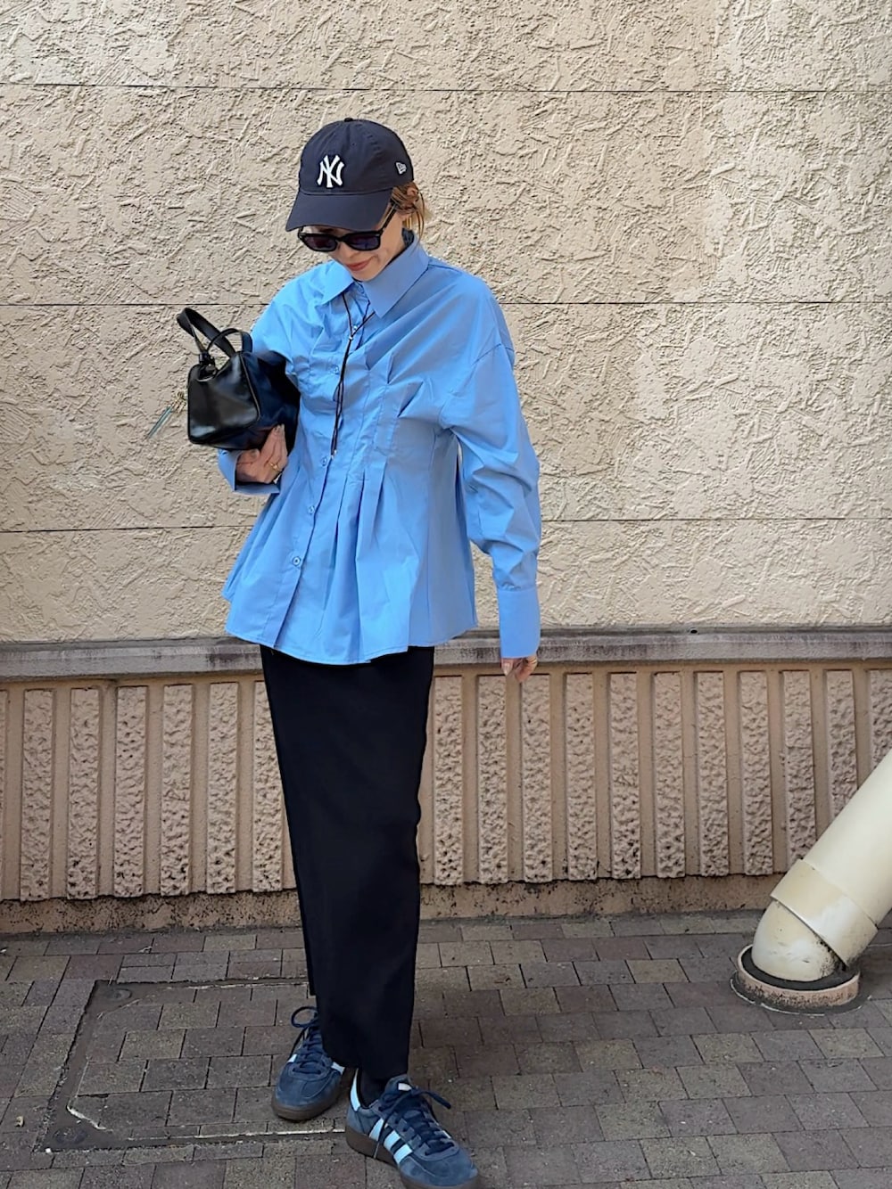 ブラウスの持つきちんと感に、スニーカーのラフさを掛け合わせたワンツーコーデは、動きやすさを確保しながらも、だらしなく見えないのがメリット。少しゆとりのあるトップスデザインを選ぶとリラクシーな印象が生まれ、鮮度もアップします。パンツ以外のアイテムをさりげなくブルー系でリンクさせれば、統一感のある着こなしに。