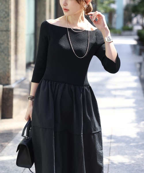 “ちゃんと選んでる感”を一枚で演出できる、リブニットとナイロンの異素材ミックスワンピース。気負っていないのに手抜きに見えず、スクエアネックの抜けが効いて、ほんのりエレガントな雰囲気もまとえます。デニムシャツを羽織ってカジュアルにも、モノトーンで統一してモードにも決まる万能派です。